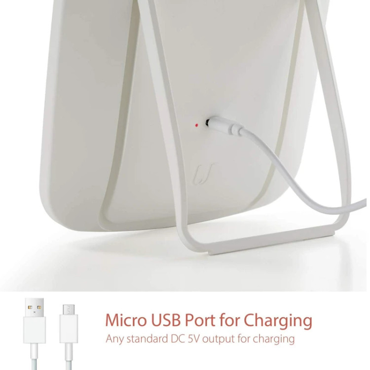 دکمه لمسی داخل آینه زاویه تکیه گاه قابل تنظیم تا ۱۰۰ درجه باتری لیتیوم یون ۲۴۰۰mAH داخلی قابل شارژ با کابل USB type C سه رنگ روشنایی آفتابی، مهتابی، طبیعی (ترکیب مهتابی و آفتابی) شارژدهی ۵ ساعت زمان شارژ ۵.۵ ساعت قابلیت تنظیم میزان روشنایی دارای حافظه میزان روشنایی آینه کیفیت بالای ضد ترک از جنس HD explosion-proof